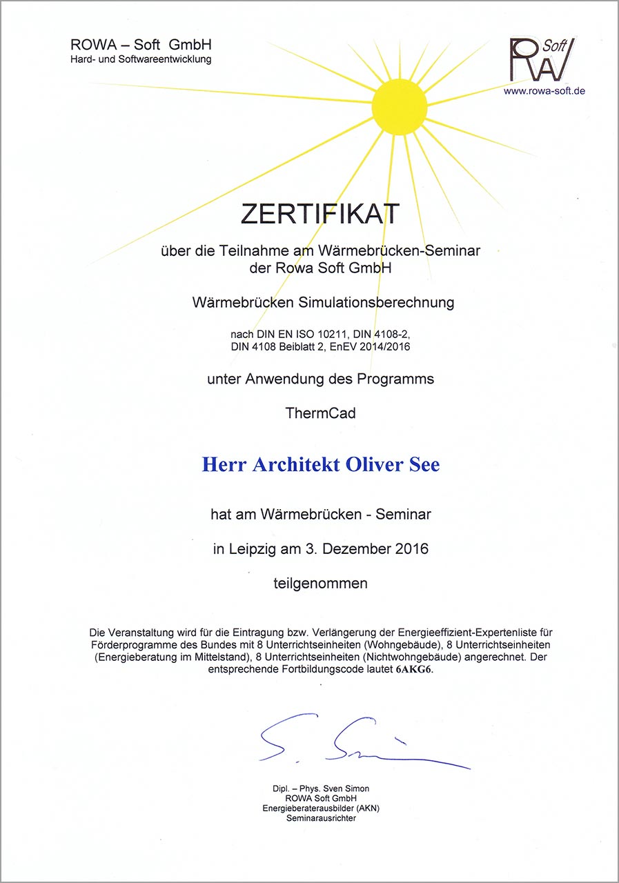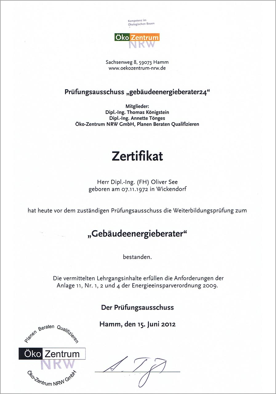 Durch diese Zertifizierungen und zusätzlichen Qualifikationen ist es Oliver See möglich, seinen Bauherren ein erweitertes Leistungsspektrum im Bereich "Gebäudeenergieberatung" anzubieten.